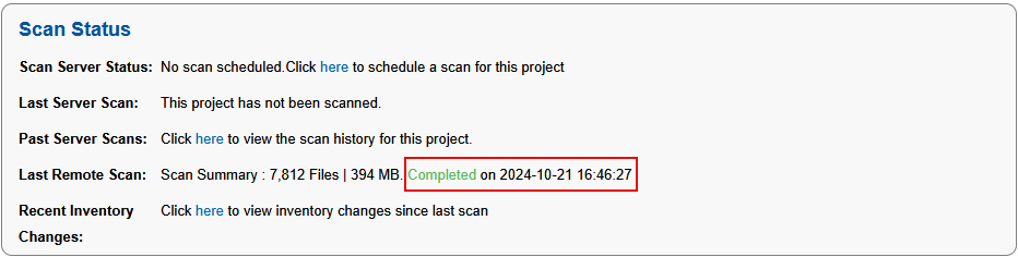 To view the status of the import of scan results into your Code Insight project from the most recent remote scan run for your project, navigate to the project’s Summary page. In the Scan Status section, locate the status and timestamp of the latest import. (See Summary Tab for a description of all the remote-scan details.)