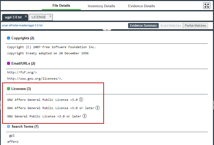 - Locate a license reference on the File Details tab, as in this example of the Evidence Summary subtab on File Details tab.
