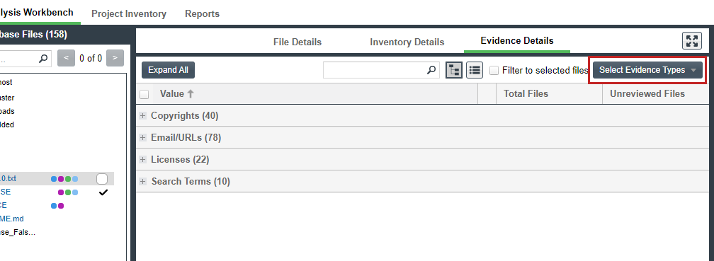 The Evidence Details pane in the Analysis Workbench enables you to view the list of open-source and third-party textual evidence detected across the codebase during the scan. The list shows instances of evidence for the following entities and, for each instance, includes the total number of files in which the instance was found and the number of those files that are not marked as reviewed: