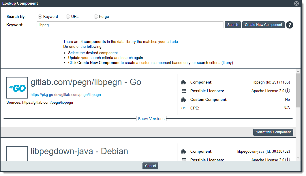 To search for a component, select the type of search you want to perform ( Keyword , URL , or Forge ), and enter the required search criteria. For information on these searches and the criteria you must enter for each, see Guidelines for Lookup Component Searches.