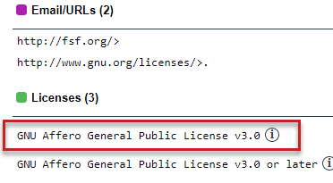 The Code Insight scan can use information in the Code Insight Data Library to automatically select a license for a codebase file based on evidence found in the file. The scan also uses the Data Library to select a license for an automatically generated inventory item based on the inventory’s open-source or third-party component. You can view details from the Data Library for this license by simply clicking next to any license reference in the Analysis Workbench or the Project Inventory tab.